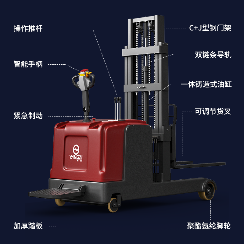 揚子推高車 CQD-J:不用條托盤的前移式電動堆高車,增強載重,通過性強,貨叉前段可緊貼地面方便叉取貨叉,而且門架后仰時貨物穩定不易滑落,使用更安全放心。