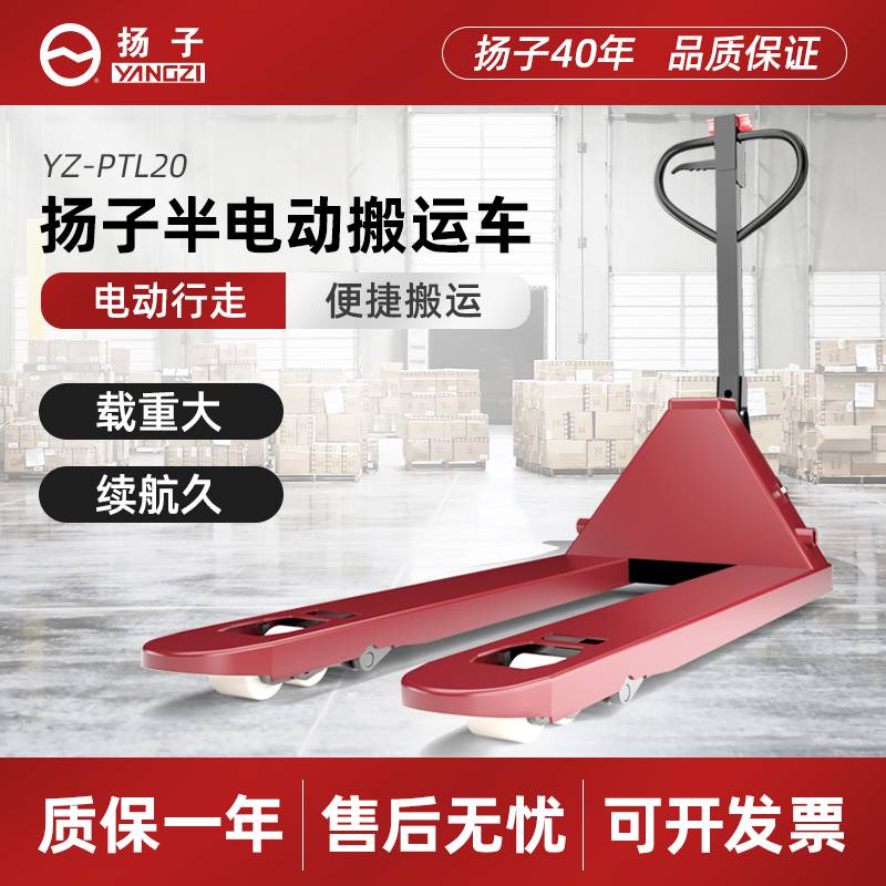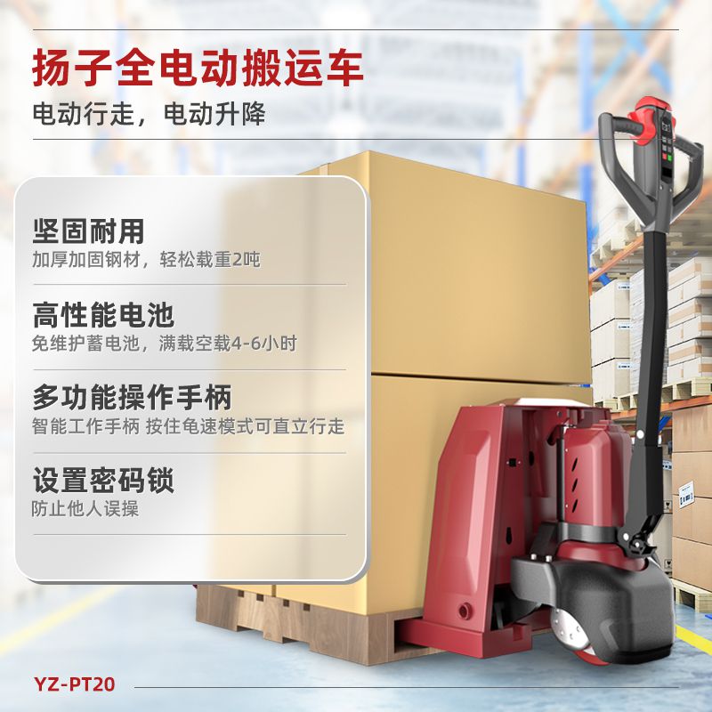 揚子PTL電動搬運車:電動省時省力,多功能密碼手柄設計,雙電機驅動,超厚鈑金件,人體功效學手柄設計,超長續航6-8小時,增壓減壓,省力操作。一鍵啟動腳踏泄壓